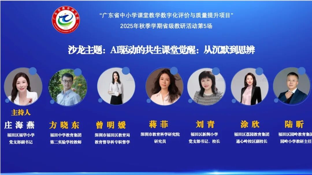 “AI驱动的共生课堂觉醒:从沉默到思辨”主题教研沙龙由深圳市福田区福华小学党支部副书记庄海燕主持,深圳市教科院研究员蒋菲、福田区新洲小学党支部书记刘青、荔园教育集团通新岭校区副校长涂欣、福田区专职督学曾明媛、园岭小学教研主任陆昕、福田区第二实验学校方晓东等6位老师,围绕直面教育之痛、剖析课堂思维 “沉睡”的症结,寻找教育之变、探索课堂思维“激活”的路径,书写教育之盼、畅谈课堂思维“绽放”的多彩图景三个核心议题展开。