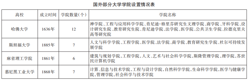国家发展战略对学科设置调整的布局结构提出要求,而满足要求则需要作为支撑单元的高校作出具体响应。“点”的集中突破还是“面”的多元布局既与办学历史有关,也与学校类型定位以及未来规划等紧密相关,实质是高校在学科设置中是追求“多而全”还是“少而精”的问题。从国际经验来看,办学水平较高且经费多样的研究型大学所开设的学科数量并不多且较为综合,而面向地方以培养学生为主的应用型大学却经营着数量庞大的学科专业。在学科发展中,学院是最重要的主体[19],学院的设置数量在一定程度上反映着学科设置规模以及综合程度。从我国的C9大学来看,独立设置的二级院系普遍在30个以上,个别甚至达到50个,学科设置的数量更加广泛且基于行政化独立建制的倾向更为突出。“考察世界各国大学的组织架构,遵循学科逻辑已然成为学院设置的基本共识。”[20]美国的哈佛大学在本科生院、继续教育学院之外,设有12个专业学院及拉德克里夫高等研究院;斯坦福大学设有7个学院;麻省理工学院有6个学院。德国的慕尼黑工业大学自建校以来,学院数量一直保持在10个左右,近年来又整合成为7个跨学科交叉学院。(见下表)