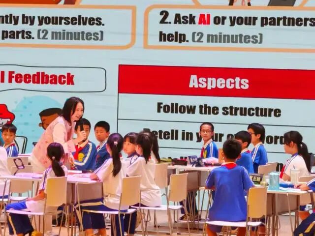 此前,她已有过“项目式学习”的诸多探索。在她的英语课堂上,孩子们会用英语设计店铺标语,在跳蚤市场摆摊售卖;结合学校建校30周年,发挥创意设计校庆吉祥物,并用英文口述给AI软件生成……