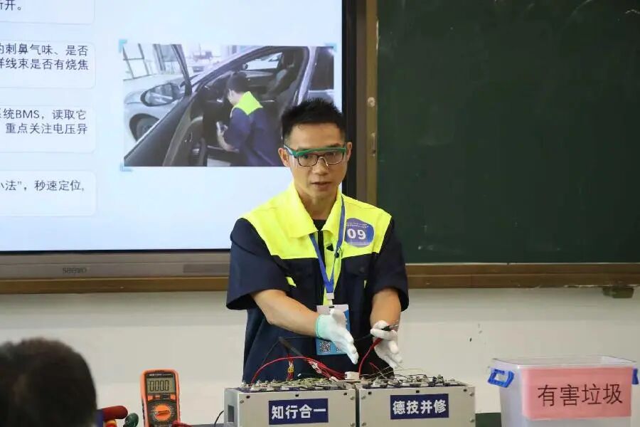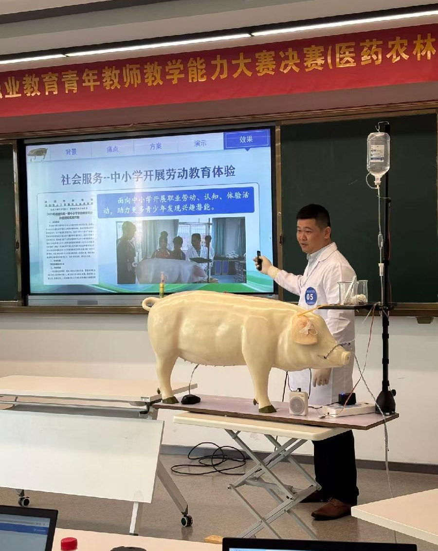 此外,还有不少青年教师携自制教具上台,秀出“高超技艺”的同时,也展现了“能教、能创、能实践” 的综合实力。有选手自制了数字化教具辅助演示猪耳静脉注射,“我在教具中植入了编程程序,让它能做到画面、声音同步提示,一步一反应,能跟学生产生互动,激发学生的学习兴趣。”有选手则推着自主研发的“大块头”上场,他向记者介绍说,“这个自研的新能源汽车驱动电机实验平台将电机的逻辑简化,操作时更简单也更安全,方便学生初学时使用。”
